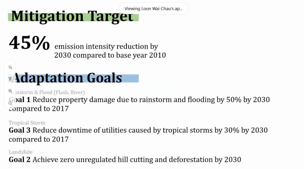 The meeting reviewed the proposed target to reduce 45% GHG emission intensity by 2030 compared to the base year 2010. In addition, there were three adaptation goals suggested by UTM, namely 1) reduce property damage due to rainstorm and flooding by 50% by 2030 compared to 2017; 2) reduce downtime of utilities caused by tropical storms by 30% by 2030 compared to 2017; 3) achieve zero unregulated hill cutting and deforestation by 2030.